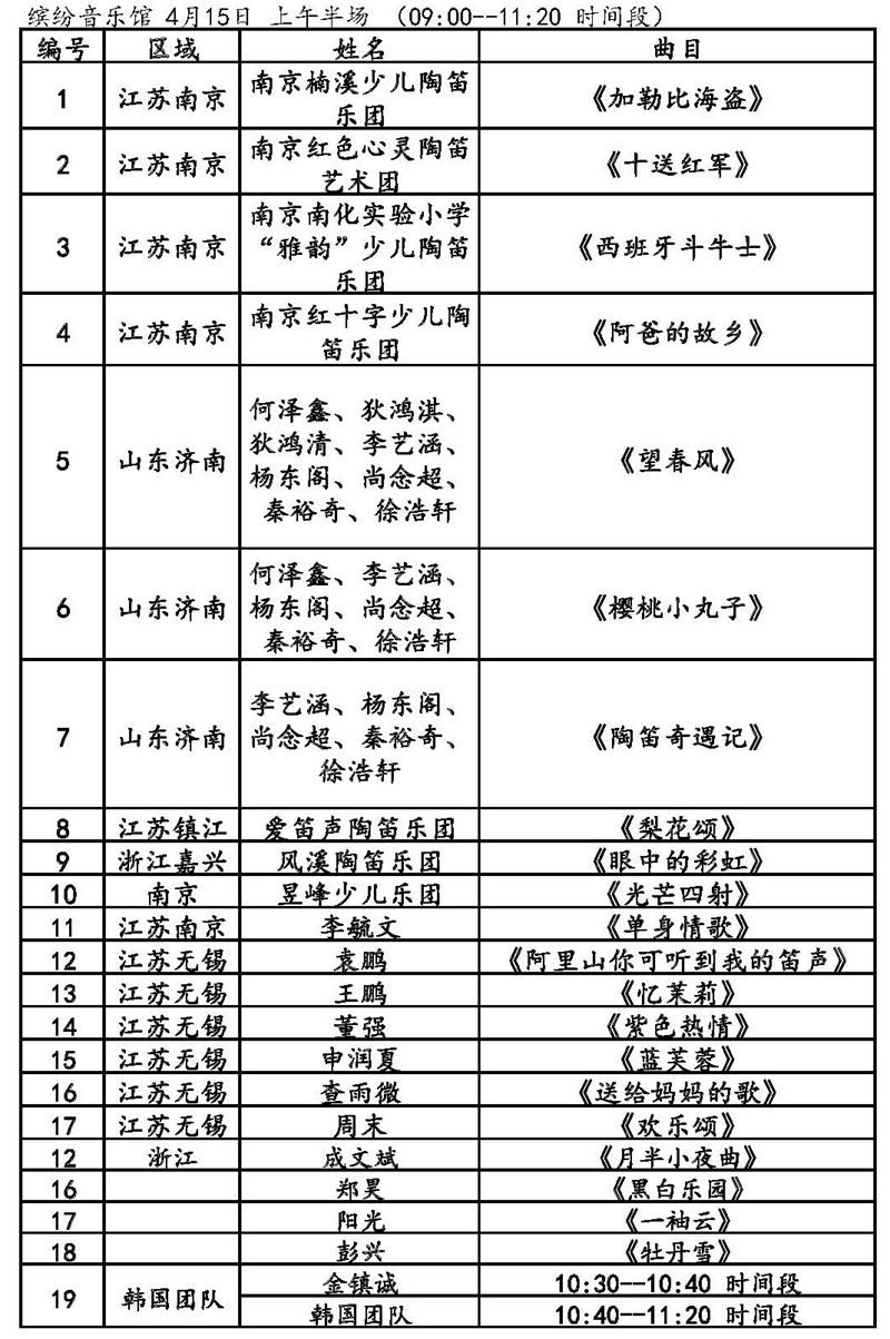 第九屆風(fēng)雅陶笛節(jié)活動日程4月14日表演節(jié)目單及時間繽紛音樂館風(fēng)雅陶音樂廣場4月15日表演節(jié)目單及時間繽紛音樂館風(fēng)雅陶音樂廣場